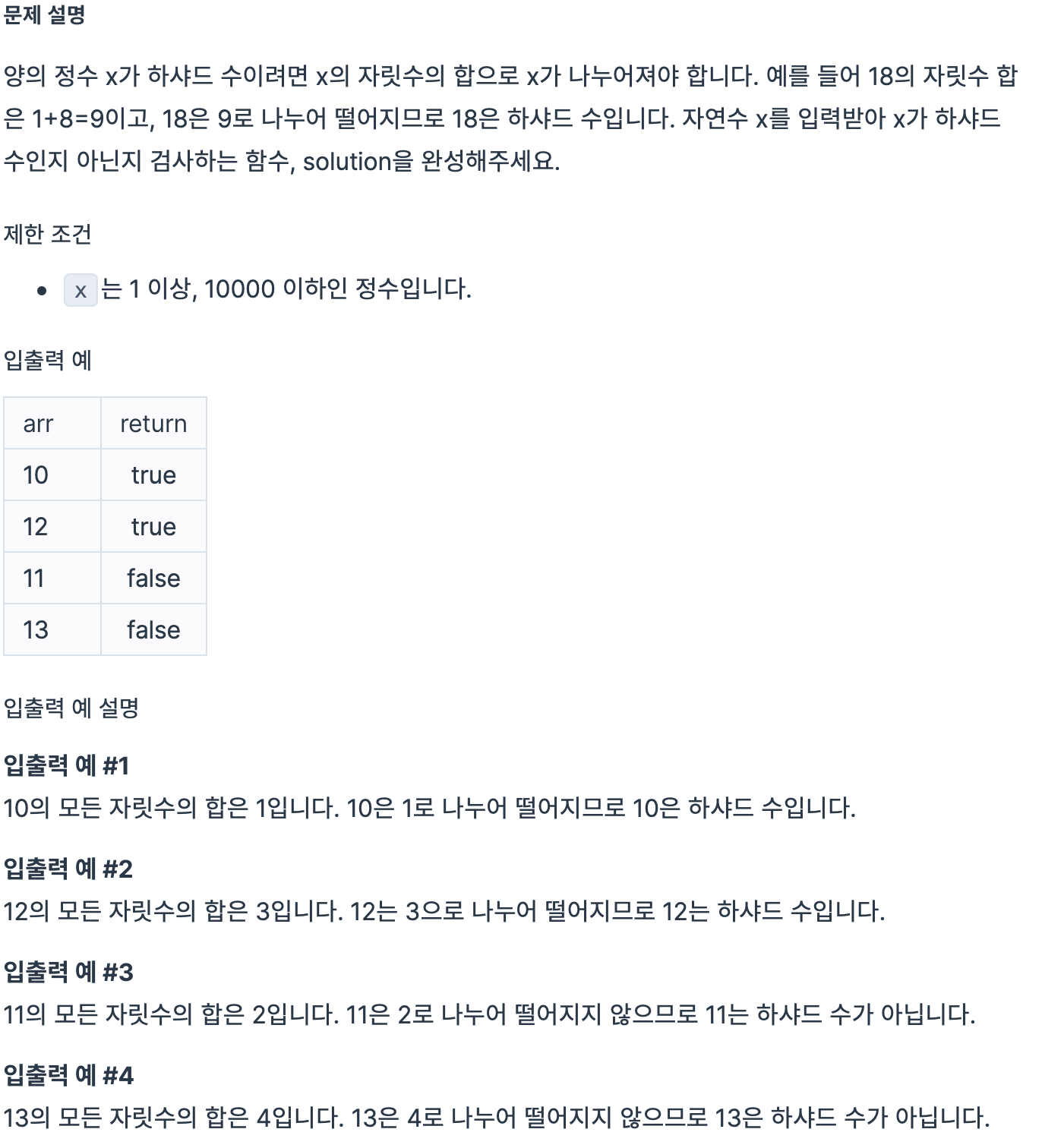 3) x 와 sum 과의 나머지 연산에서 나머지가 없으면 하샤드 수 true 를 반환하게 구현했다.