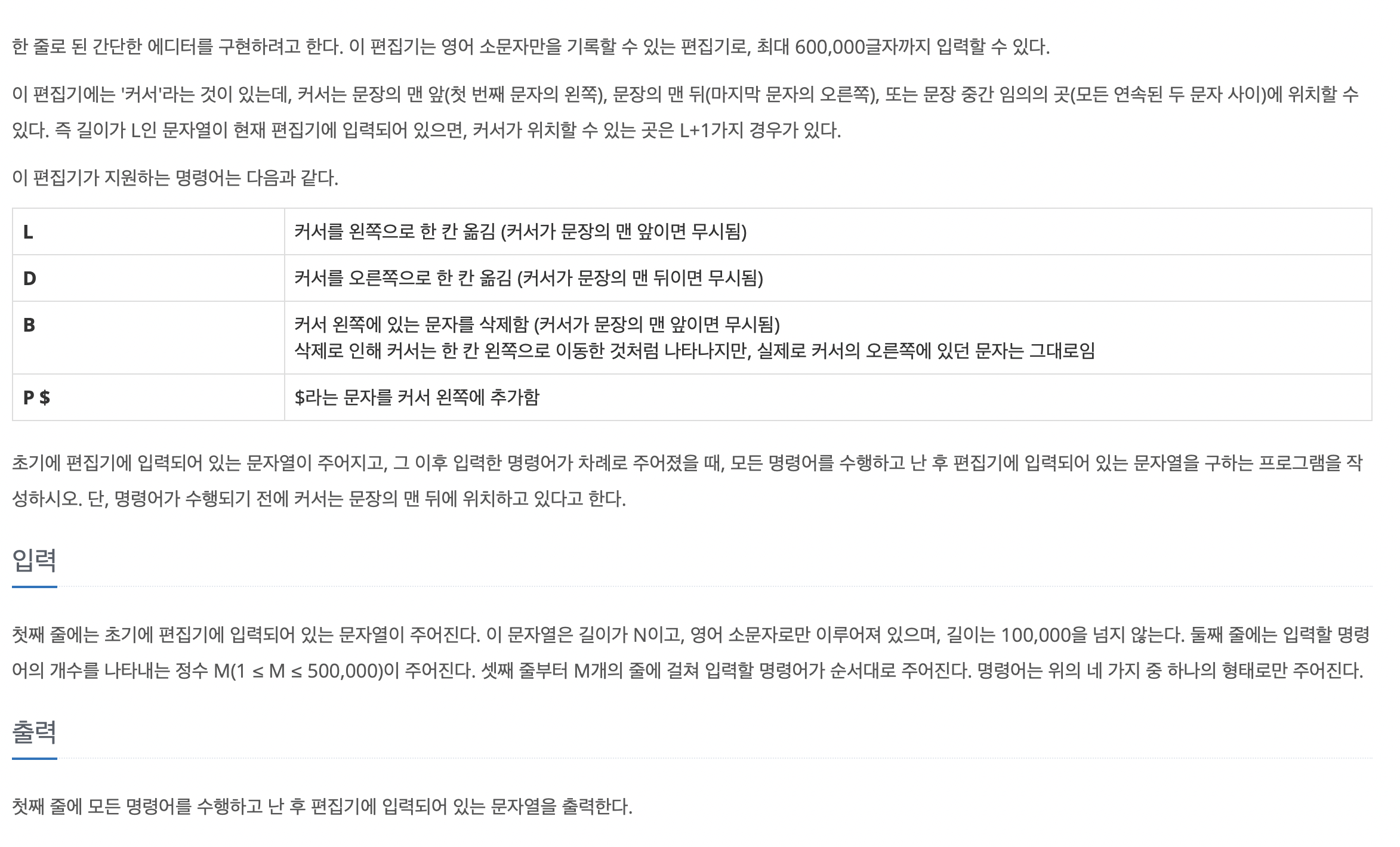 입력된 결과에서 현 커서의 위치가 이동될 때 마다 새로운 문자열(commandResult)에 Push 해 주거나 원 문자열에서 pop 해주면서 계산해주어 풀이했습니다.
