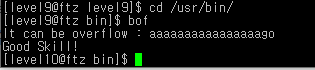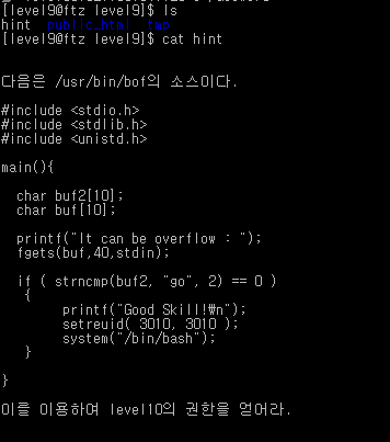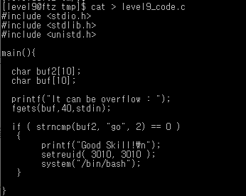 3. buf2[버퍼2] 의 처음 2글자가 "go" 라면, 사용자와 그룹권한을 level10 으로 바꾸고, 프롬프트와 쉘을 출력하게 한다