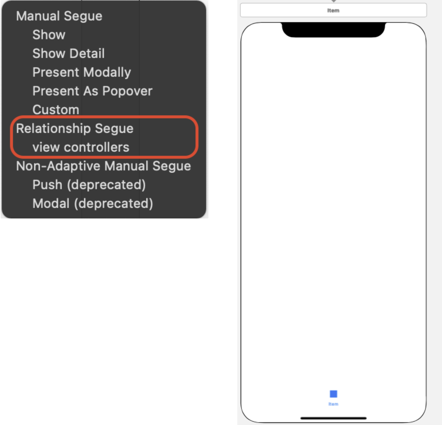 → 이때, Relationship Segue view controllers 를 선택하면 탭바와 연결됨을 확인할 수 있다