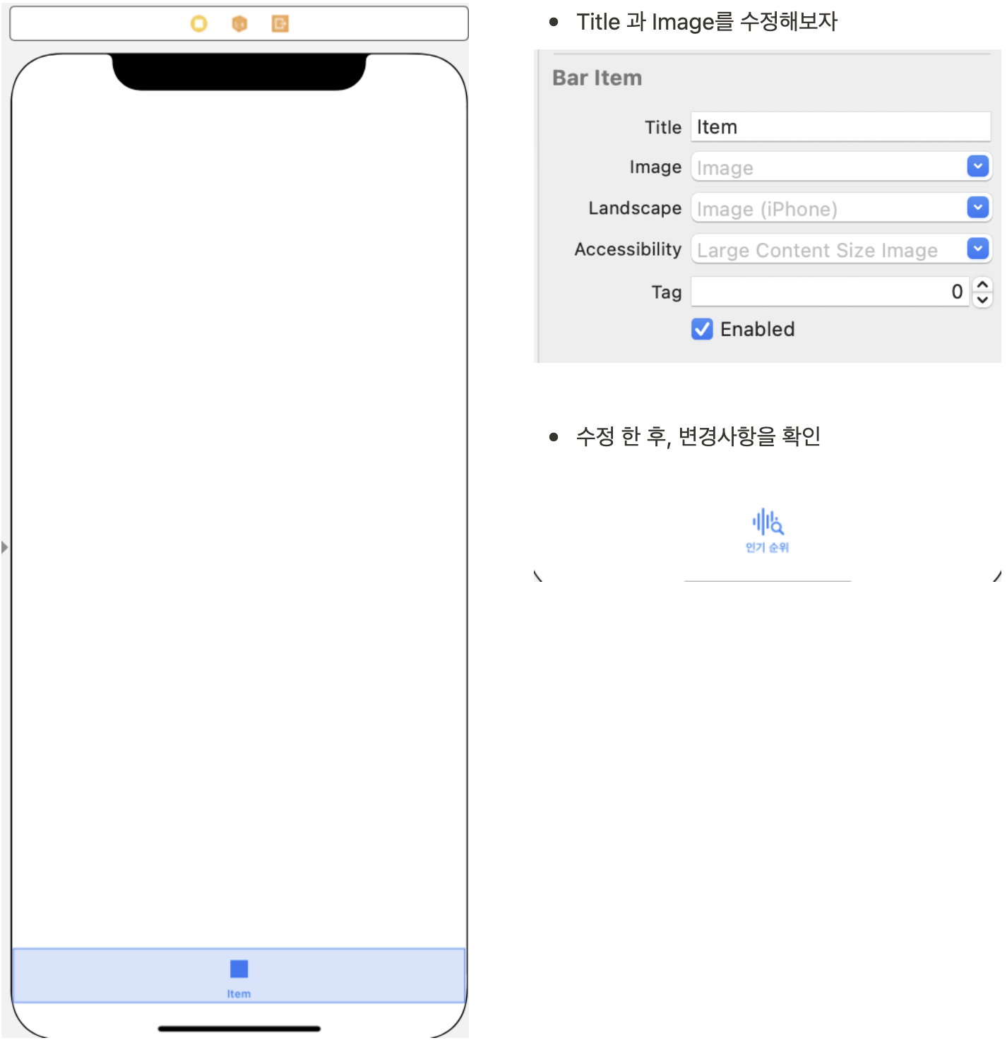 3. 연결된 화면에서 Tab을 선택하여, 인스펙터 창에서 Tab Item을 수정한다 ( Title 에는 Tab Item의 이름을, Image 에서 Tab Item의 기호를 수정한다 → HIG를 참고하여 SF Symbol 활용 )