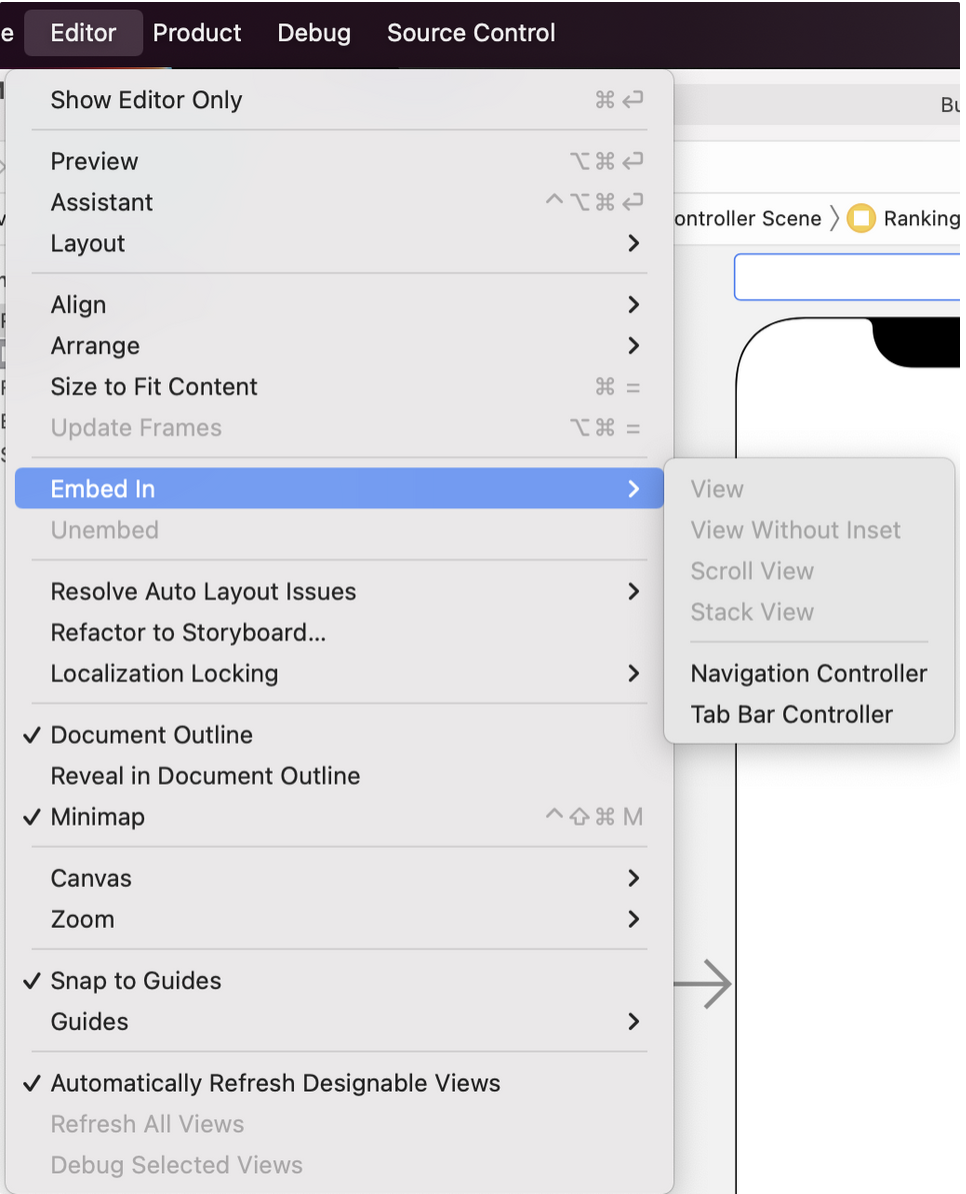 - TabBar 로 표현할 View를 선택한후, 상단의 Editor - Embed In - Tab Bar Controller 를 선택한다