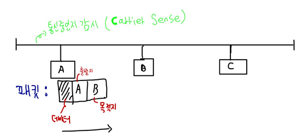 : 네트워크 자원을 쓰고있는 PC 나 서버가 있는지 감시하는것, 누군가 통신을 수행중이라면 통신이 끝날때까지 대기